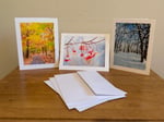 This set of 3 notecards , with envelopes, offers fall and winter scenes for those who love these seasons. I took photographs of these scenes and then processed them to look like watercolors. From left to right are Fall Trail, Snow on Wahoo, and Snowy Trail. All 3 photographs were taken in Missouri,